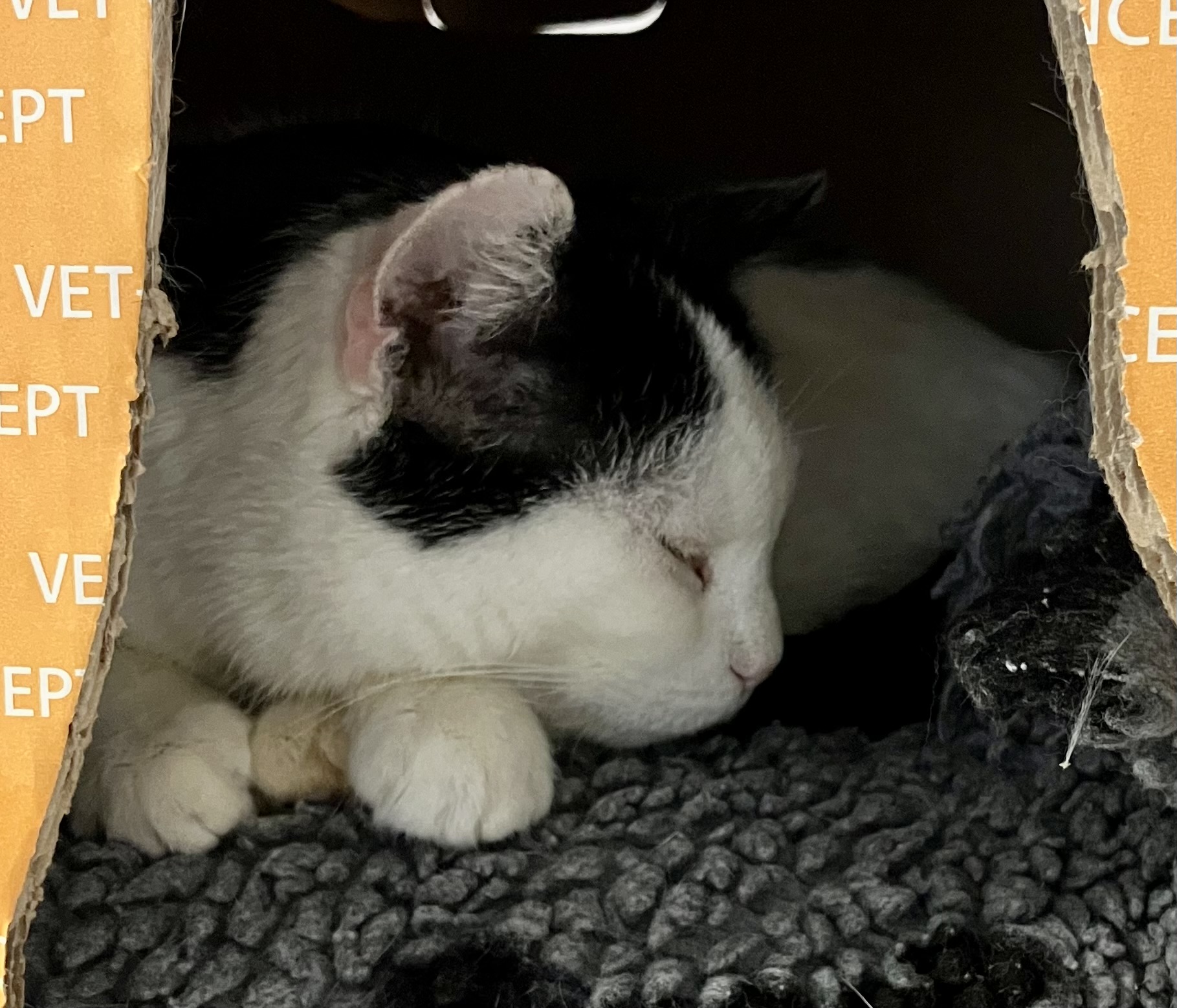 Mittlerweile hat Ashly sich im Tierheim eingelebt und chillt tagsüber in einem der vielen Kartons im Katzentrakt.