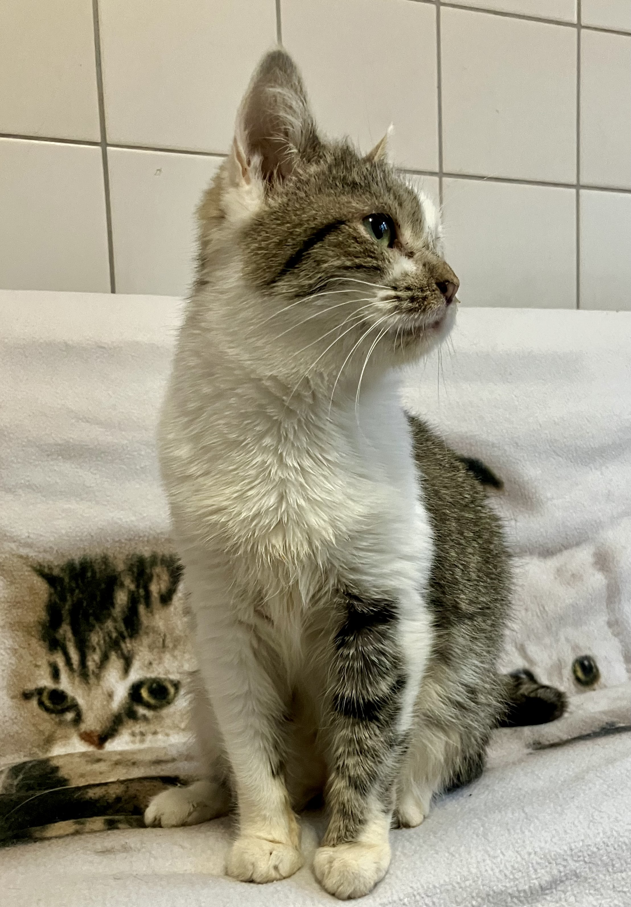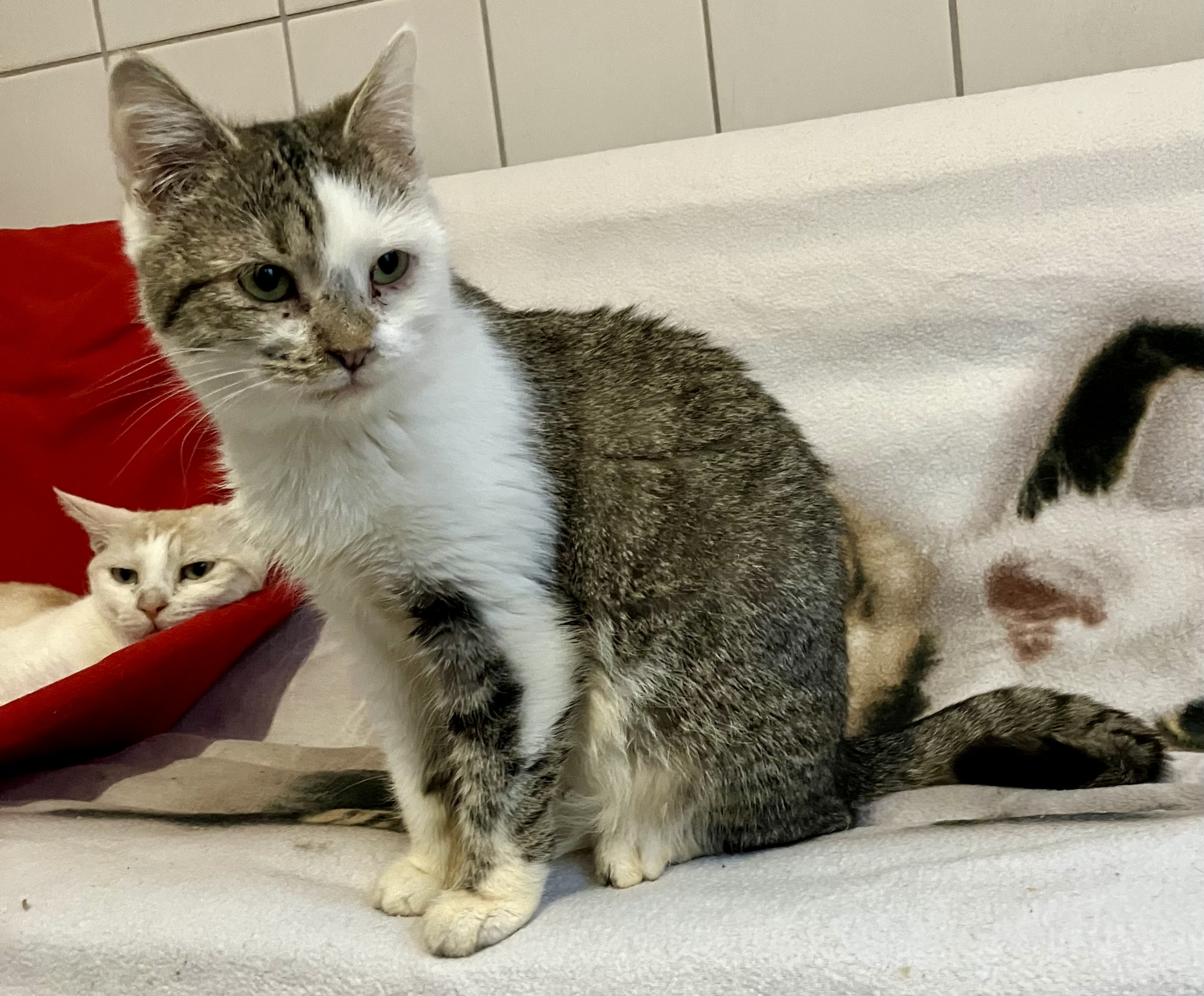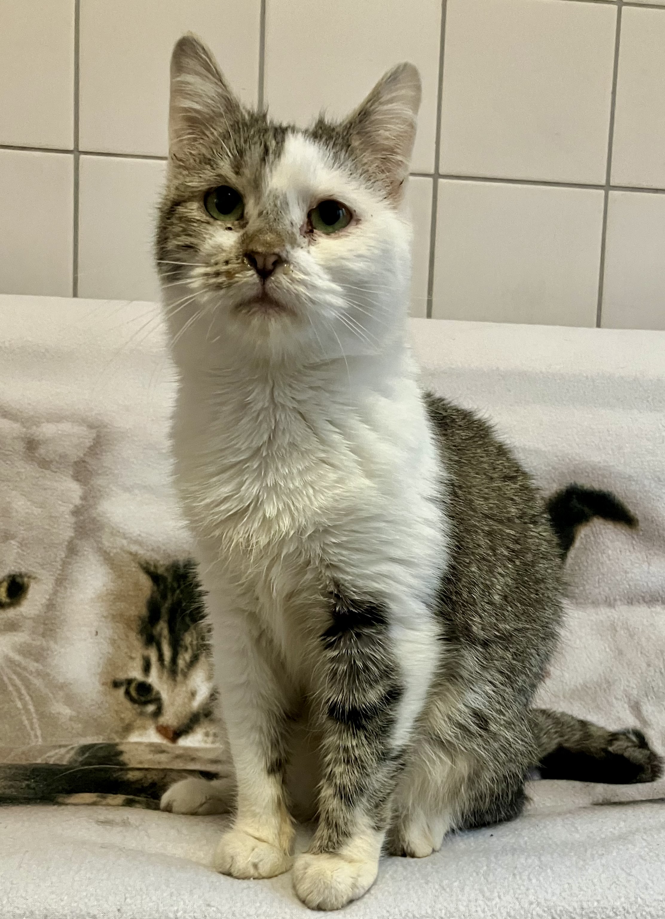 Ma wurde zusammen mit vier anderen Katzen sehr krank und sehr dünn gefunden. Mittlerweile geht es ihr verhältnismäßig gut. Die Schnupfennase muss noch abheilen. Ma ist verträglich und umgänglich.